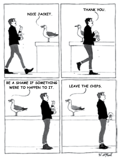 A tirinha mostra Dolores entendendo literalmente a fala do atendente, que diz “mais três reais você leva uma batata grande”. Em vez de entender que a expressão “batata grande” se refere ao tamanho do pacote de batatas fritas, Dolores imagina uma batata enorme, conforme o terceiro quadro.
